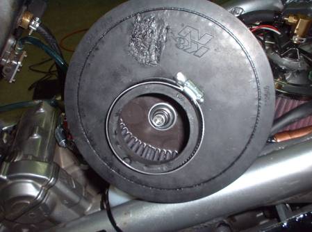 manifold using a couple of hose clamps around some NAPA fuel filler line. Throttle cable is split to actuate each TB