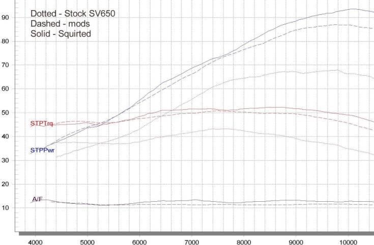 the stock manifolds and airbox for the dyno run. The only difference between this run and the Squirted run is from